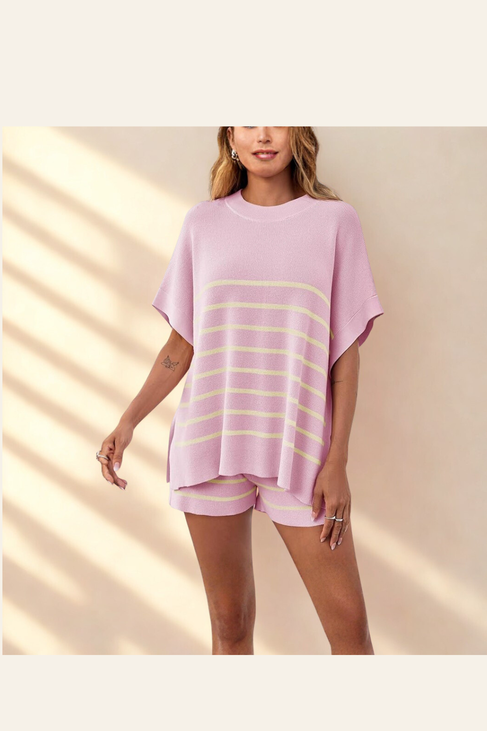 An oversized batwing top with matching high-waisted shorts—cute, comfy, and made for warmer days. -