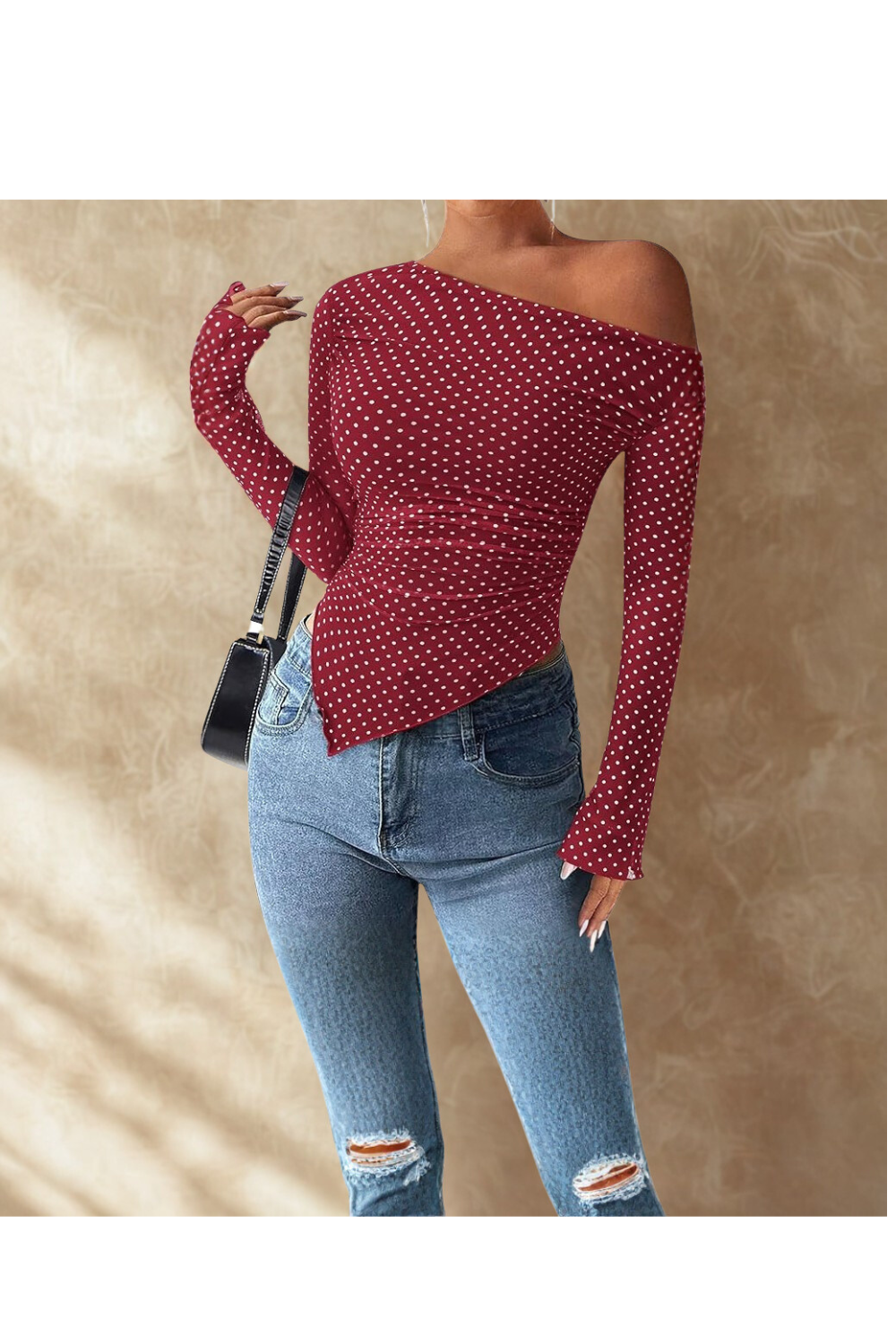 This red polka-dot Y2K top hugs in all the right places with a flirty off-shoulder silhouette. -