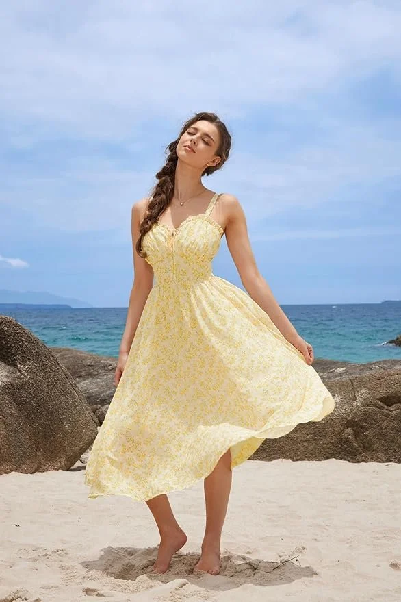A flowy floral milkmaid dress with a corset fit and pockets—perfect for warm days and golden hours. -
