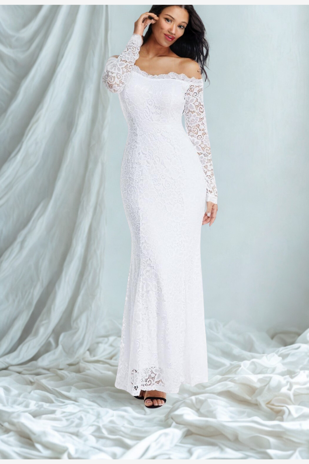 This off-shoulder floral lace mermaid dress is designed to flatter, romance, and captivate. -